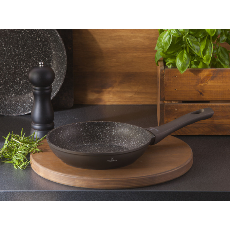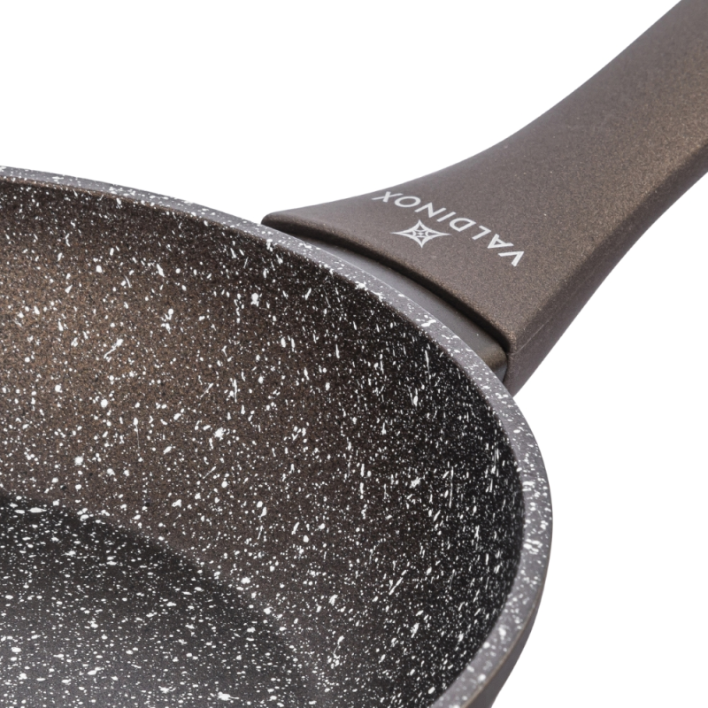 Valdinox Aurum je moderna kolekcija koja kombinira dizajn s izdržljivošću i čvrstoćom kuhinjskog pribora. Lonci, tave za pečenje i prženje izrađeni su od aluminija, koji je izrađen metodom kovanja. Tava je prekrivena slojem koji se ne lijepi. Zahvaljujući njemu, pržena hrana ne zagori, a lonac se lako čisti. Kuhanje u posuđu Valdinox Aurum je zdravo jer trebate dodati samo malu količinu masnoće za prženje. Udobne ručke su nježne na dodir zahvaljujući soft touch premazu. Ručke se ne zagrijavaju. Korištenje debelih stijenki i dna u posuđu čini ih otpornima na deformacije, a također osigurava ravnomjernu raspodjelu topline. Valdinox Aurum je savršeno rješenje za sve vrste štednjaka (uključujući indukciju). Čvrstoća proizvoda, učinkovitost i ergonomija čine Valdinox Aurum savršenim rješenjem ne samo za profesionalce, već i za entuzijaste kuhanja.