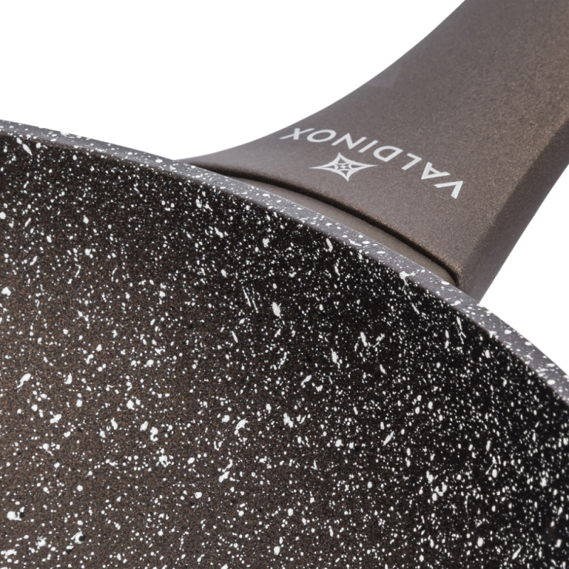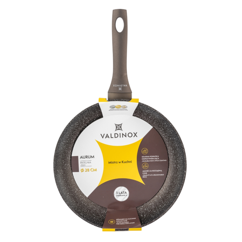 Valdinox Aurum je moderna kolekcija koja kombinira dizajn s izdržljivošću i čvrstoćom kuhinjskog pribora. Lonci, tave za pečenje i prženje izrađeni su od aluminija, koji je izrađen metodom kovanja. Tava je prekrivena slojem koji se ne lijepi. Zahvaljujući njemu, pržena hrana ne zagori, a lonac se lako čisti. Kuhanje u posuđu Valdinox Aurum je zdravo jer trebate dodati samo malu količinu masnoće za prženje. Udobne ručke su nježne na dodir zahvaljujući soft touch premazu. Ručke se ne zagrijavaju. Korištenje debelih stijenki i dna u posuđu čini ih otpornima na deformacije, a također osigurava ravnomjernu raspodjelu topline. Valdinox Aurum je savršeno rješenje za sve vrste štednjaka (uključujući indukciju). Čvrstoća proizvoda, učinkovitost i ergonomija čine Valdinox Aurum savršenim rješenjem ne samo za profesionalce, već i za entuzijaste kuhanja.