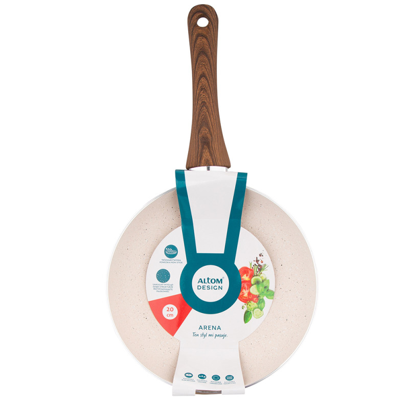 Veličina tave: promjer – 20 cm · prženje u tavi Arena jamči izvrstan okus i miris pripremljenih jela, uz zadržavanje svih nutritivnih vrijednosti · Tava je prekrivena visokokvalitetnim neprijanjajućim premazom s efektom skale koji ima svojstva koja se ne lijepe, sprječavajući lijepljenje · Tava ima debele zidove i dno koji omogućuju bolje nakupljanje i raspodjelu topline, zahvaljujući kojima Jela pripremljena u njemu brže se prže i duže održavaju temperaturu · Prikladan za sve vrste štednjaka, uključujući indukcijske štednjake · Visokokvalitetni neljepljivi premaz čini Održavanje tave čistom vrlo je jednostavno