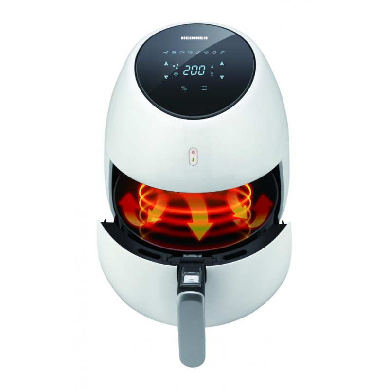 Opis proizvoda Heinner HAF-B2000WH friteza za vrući zrak, snaga: 2000W, kapacitet: 5L, digitalni zaslon, upravljačka ploča osjetljiva na dodir, neprijanjajuća odvojiva posuda, podesivi termostat: 80-200 °C, mjerač vremena – maksimalno trajanje 60 min, odvojiva košara za pripremu, zaštita od pregrijavanja, protuklizne noge Neto dimenzije Visina 33,7 cm Dubina 34,8 cm Širina 28 cm Vrući zrak Kapacitet 5L Snaga 2000W Neprijanjajuća odvojiva posuda