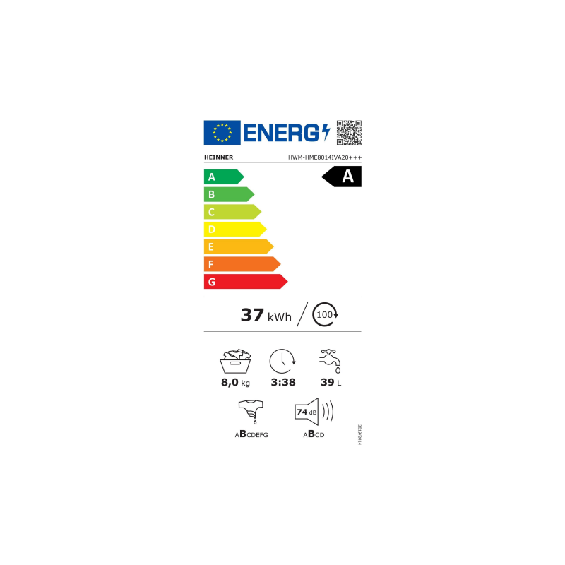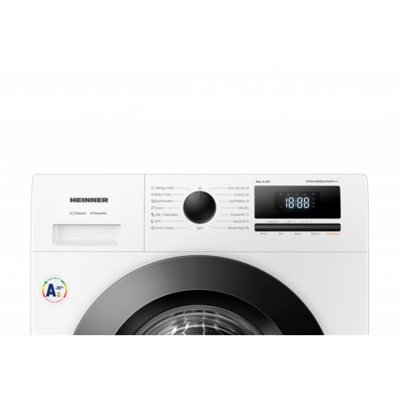 Perilica rublja HEINNER HWM-HME8014IVA20+++, kapacitet 8 kg, brzina centrifuge 1400 o/min, energetski razred A-20, inverterski motor, 15 programa pranja, digitalni zaslon, brzi program od 15 minuta, program s parom za alergičare, program s parom za dječju odjeću, funkcija odgode završetka, dodatno ispiranje, pred pranje, funkcija dodavanja rublja tijekom pranja, odabir temperature, odabir brzine centrifuge, zaštita za djecu. Dimenzije (D × Š × V): 59,5 × 54 × 84,5 cmBoja: bijela.