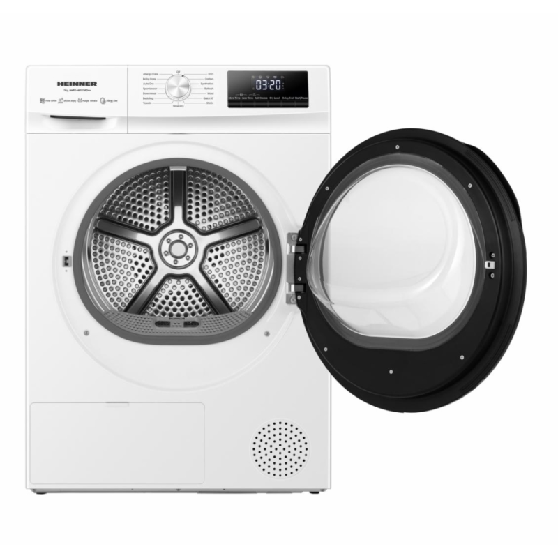 HEINNER SUŠILICA RUBLJA S TOPLINSKOM PUMPOM HHPD-HMY70FD++, KAPACITET PUNJENJA 7 KG, ENERGETSKA KLASA D, DIGITALNI ZASLON, SVJETLO U BUBNJU, 15 PROGRAMA, PROGRAM ZA VUNU, ECO PROGRAM, FUNKCIJA PROTIV NABORA, ODABIR STUPNJA SUŠENJA, ZAŠTITA ZA DJECU, POKAZATELJ ČIŠĆENJA FILTRA ZA DLAČICE, POKAZATELJ PUNOG SPREMNIKA ZA VODU, DIMENZIJE (ŠxDxV): 59,5x58x84,5, BOJA: BIJELA
