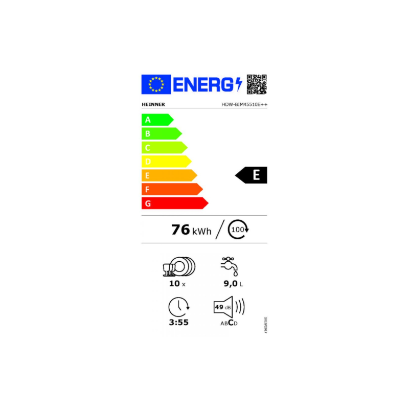 Heinner HDW-BIM45510E++ ugradbena perilica posuđa, 10 mjesta za pranje, energetska klasa E, elektroničko upravljanje, 5 programa pranja, brzi program od 30′, intenzivni program od 90 min., program intenzivnog pranja na 65°C, programabilni početak (3/6/9H), opcija pola punjenja, dodatna funkcija sušenja, gornja košara s podesivom visinom (kada je prazna), donja košara: 2 sklopiva držača za tanjure, zaštita od poplave – Aquastop, potrošnja vode: 9L/ciklus pranja, dimenzije (ŠxVxD): 45 x 55 x 82 cm