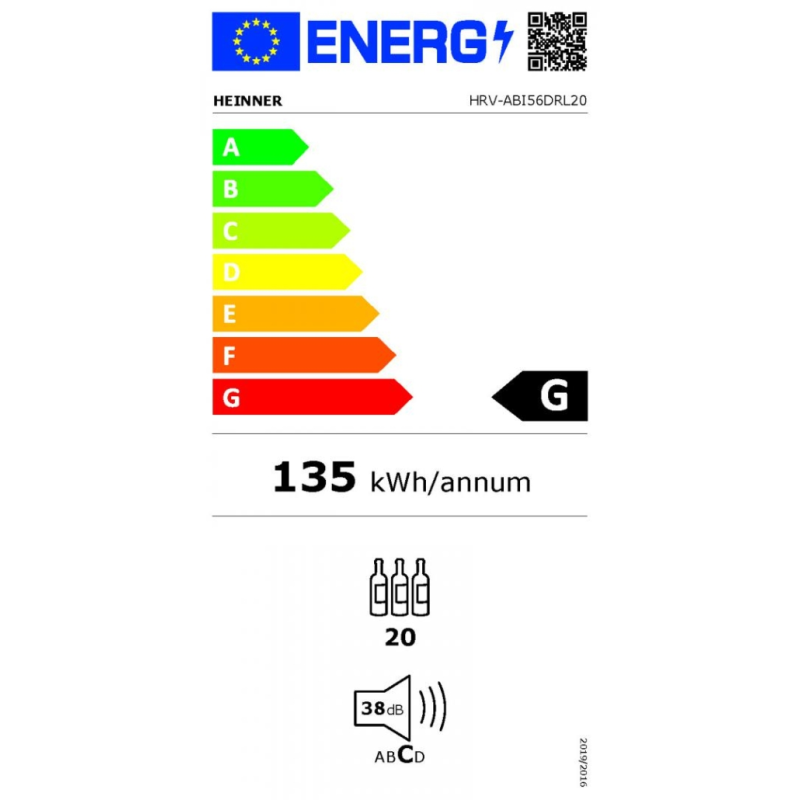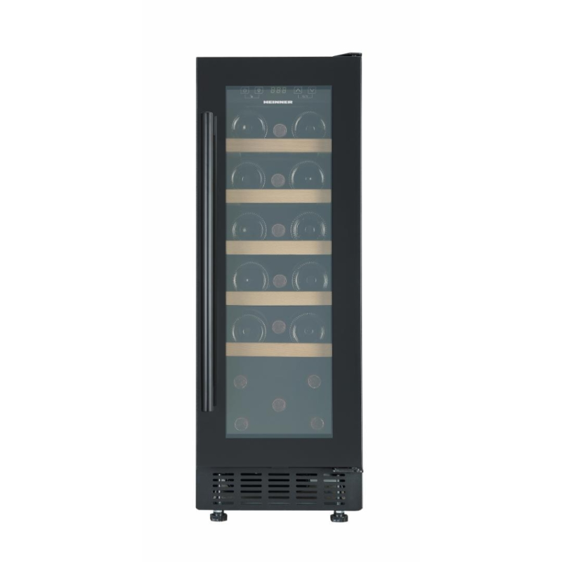 Heinner HRV-ABI56DRL20 ugradbeni hladnjak za vino, energetska klasa: G, ukupni kapacitet: 56L, kapacitet punjenja: 20 boca (750ml), jedna temperaturna zona, raspon temperature: 5~20°C, LED zaslon, elektroničko upravljanje, LED svjetlo, 5 drvenih polica, dječja brava, dimenzije (ŠxVxD): 29,5 x 57 x 82 cm, boja: Crna