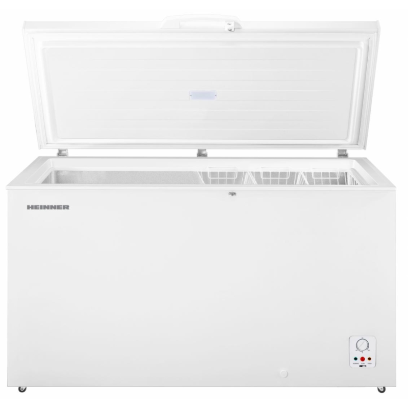 Heinner HCF-HS420E++, ukupni kapacitet: 420L, energetska klasa: E, Inverter kompresor, mehaničko upravljanje s podesivim termostatom, LED svjetlo, 3 žičane košare, ručka koja se može zaključati, kotačići za jednostavan transport, ručno odmrzavanje, kapacitet zamrzavanja: 19,0 kg/24 h, dimenzije (ŠxDxV): 144,8 x 72,1 x 85,2 cm, boja: Bijela