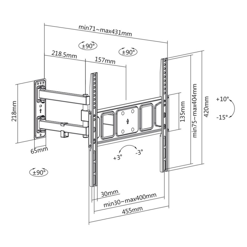 Min. dijagonala zaslona: 32 “Max. dijagonala zaslona: 55″Nagib prema gore: + 10 °Nagib prema dolje: -15 °rotacija: +/- 90 °rotacija: +/- 3 °Min. udaljenost od zida: 7,1 cmMax. udaljenosti od zida: 43,1 cmmaksimalno opterećenje: 35 kgširina: 455 mmvisina: 420 mmDubina: 71 mmMinimalna korak: 30×75 mmMaksimalna korak: 400×404 mmVESA 75x75VESA 100x100VESA 100x150VESA 100x200VESA 150x100VESA 150x150VESA 200x100VESA 200x200VESA 300x200VESA 300x300VESA 400x200VESA 400x300VESA 400x400Boja: CrnaMaterijal: Čelični”Osigurač” protiv ispadanja