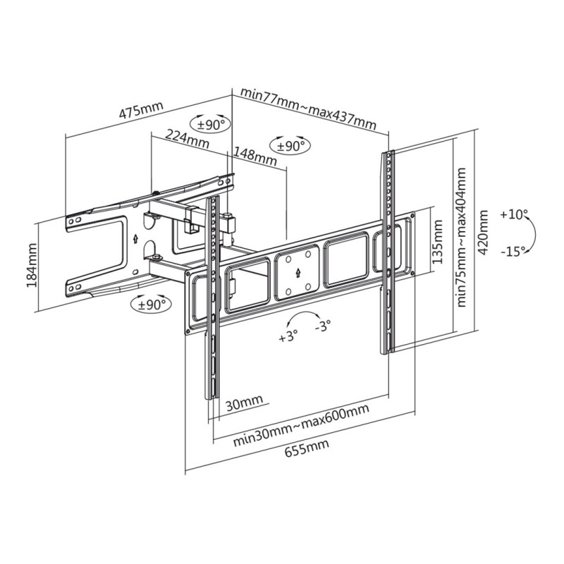Min. dijagonala zaslona: 37 “Max. dijagonala zaslona: 70″Nagib prema gore: + 10 °Nagib prema dolje: -15 °rotacija: +/- 90 °rotacija: +/- 3 °Min. udaljenost od zida: 7,7 cmMax. udaljenosti od zida: 43,7 cmmaksimalno opterećenje: 35 kgširina: 655 mmvisina: 420 mmDubina: 77 mmMinimalna razmak 30×75 mmMaksimalna razmak 600×404 mmVESA 75x75VESA 100x100VESA 100x150VESA 100x200VESA 150x100VESA 150x150VESA 200x100VESA 200x200VESA 300x200VESA 300x300VESA 400x200VESA 400x300VESA 400x400VESA 600x400Boja: CrnaMaterijal: Čelik”Osigurač” protiv pada